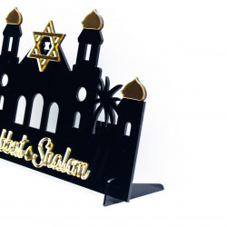 Centre de table Judaïque. Décoration pour fêtes juives. Centre de table Shabbat Shalom. L’Chaim. Synagogue sur pied. Verre acrylique Or, Agent, Blanc, Noir, Bois.