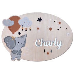 L'illustration sur le thème Petit Eléphant est imprimée sur le bois et le prénom est découpé dans du plexi, puis collé sur la plaque en bois, afin de lui apporter du relief.