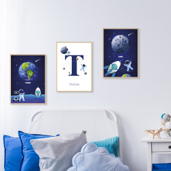 Composé de 2 affiches avec une illustration astronaute et sa fusée et 1 affiche à personnaliser avec l'initiale et le prénom de votre enfant.